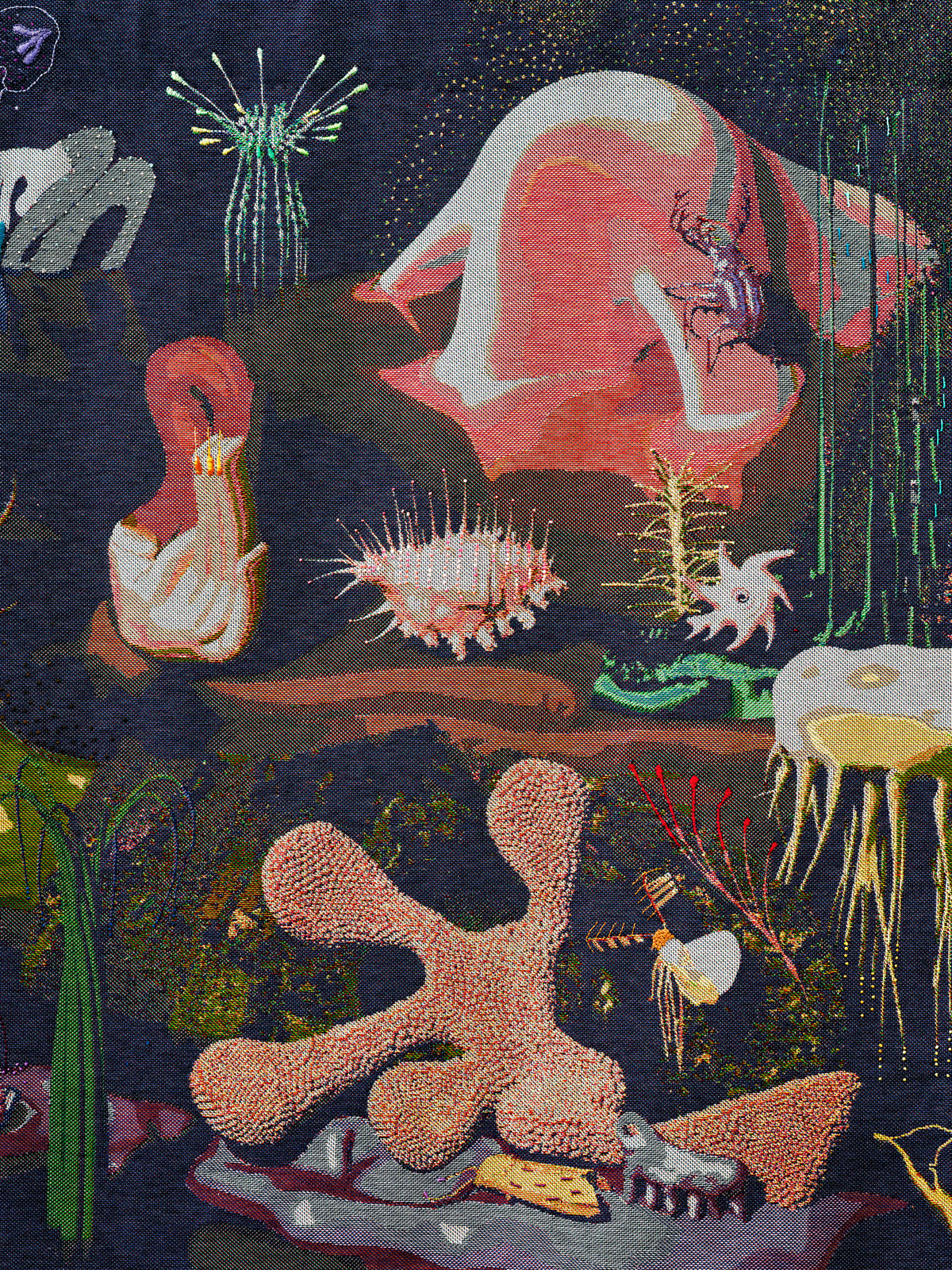 The Jacquard tapestry Känselspröt (Feelers) depicts an imaginary landscape filled with the sensory organs of various species, as well as satellite and radio antennas. The Jacquard loom was invented in 1805 and is a textile precursor to contemporary computers due to its use of punch cards. Inspired by the Baroque Chamber at the Röhsska Museum, Wang & Söderström have, for the first time produced a textile work with hand-embroidered details. The contrasting and romanticised landscapes of the Baroque era were the key inspiration for the tapestry’s dramatic motif. With lush greenery and mythological animals, the woven Verdure tapestry of the 17th century served as a model for Känselspröt. The fascination with the wonders of nature in the 17th century led to the great interest in botany in the 18th century. The naturalist Carl Linnaeus’ work “Systema Naturae” was published in 1735 and categorised nature into three kingdoms: minerals, animals and plants. Wang & Söderström challenge this system by designing a digital motif in which the boundaries between living beings and technology dissolve.